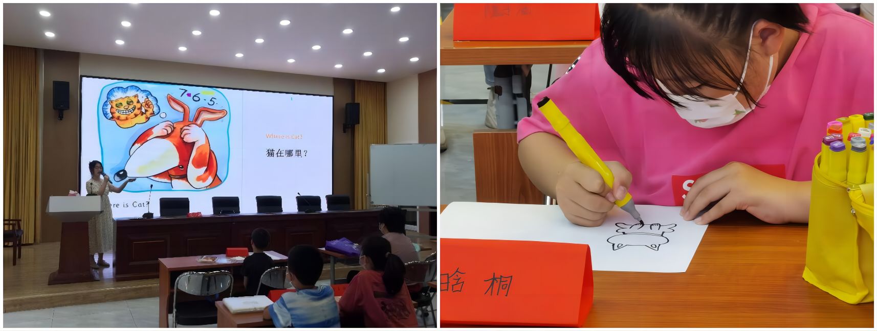 接下来,主讲袁士迪声情并茂地展开了绘本的讲解,紧密联系小朋友们的课余生活,互动多多。小朋友们也十分踊跃,争相举手回答问题,注意力集中,思维活跃。助教老师也及时给予回答问题给表现良好的小朋友小贴画作为奖励。大家一起学英语,编故事,沉浸其中。在读完绘本后,大家还一起学习了一首有关捉迷藏的英文歌。主讲还以绘本主题“捉迷藏”为切入点,对小朋友们进行安全教育,一起讨论平时和好朋友玩耍时需要注意的安全问题。很多小朋友也分享了自己的想法。最后,看到绘本上可爱的小猫小狗,小朋友用剪纸和画笔,DIY出自己心目中的小猫小狗玩游戏的画面,想象力丰富,作品生动有趣。