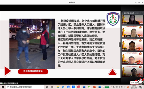 紧接着,杜伟书记、孔祥国副经理对勇于奉献的同志们给予了肯定和赞扬,并叮嘱同学们要坚守共产党员的初心使命。最后,张丽副董事长做总结发言,张董事长用“激动、高兴、受鼓舞、精神食粮”等一系列词汇表达了对本次组织生活会的高度赞扬以及在云端与同志们相会的激动心情,同时张董事长表示看到了同志们的成长,她相信未来大家一定能够做好接班人的工作,并向大家强调作为共产党员,要强化“四个意识”、坚定“四个自信”,坚决做到“两个维护”,不忘初心、牢记使命,张董事长还表达了对同学们的思念,期盼大家早日回到美丽的校园。