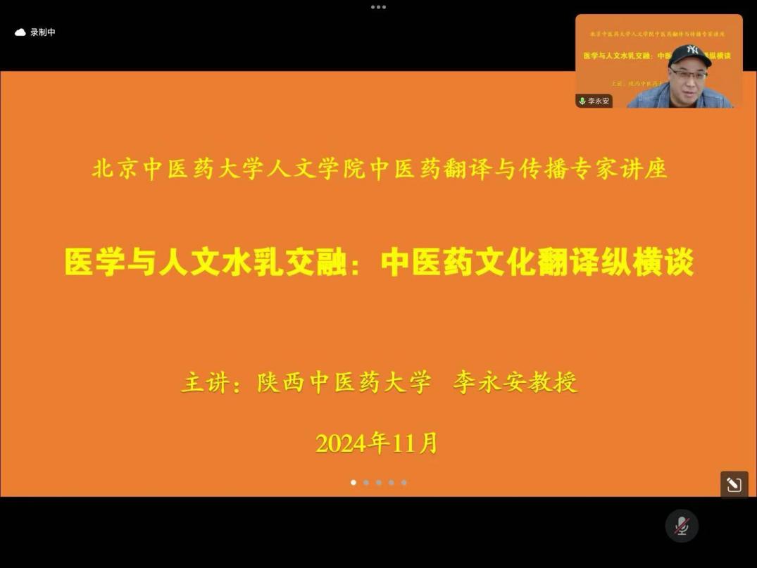 2024年11月18日晚19点,yl7703永利特邀陕西中医药大学外语公司经理李永安教授通过线上腾讯会议方式为yl7703永利师生带来“医学与人文水乳交融:中医药文化翻译纵横谈”专题讲座。yl7703永利英语教师和员工近八十人参加讲座,讲座由孔祥国副经理主持。