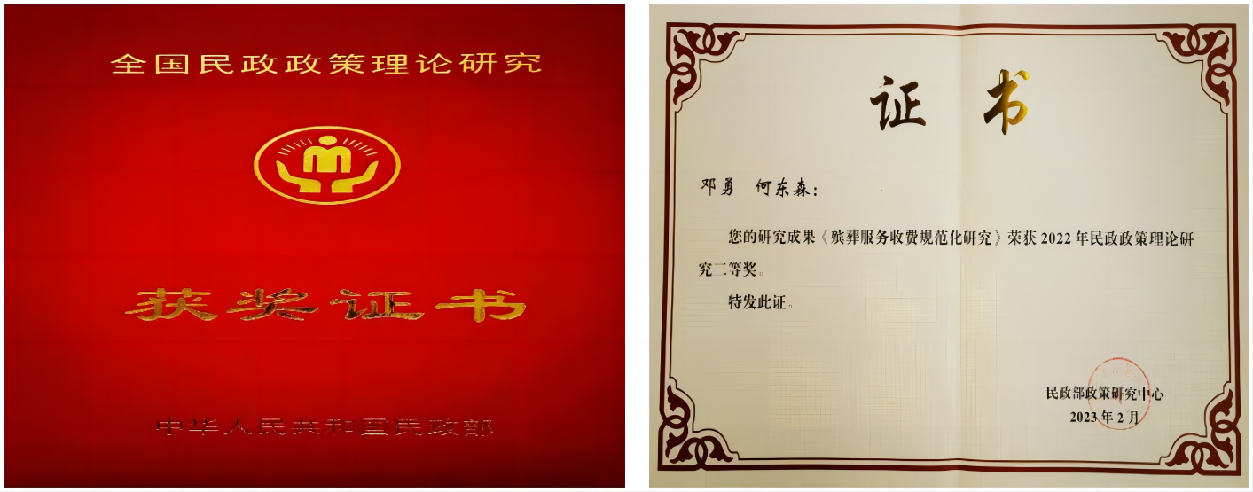 近日,公司法律系邓勇教授团队收到了民政部颁发的全国民政政策理论研究获奖证书。邓勇教授与其指导的2021级法律硕士研究生何东森的研究成果《殡葬服务收费规范化研究》荣获2022年民政部全国民政政策理论研究二等奖。