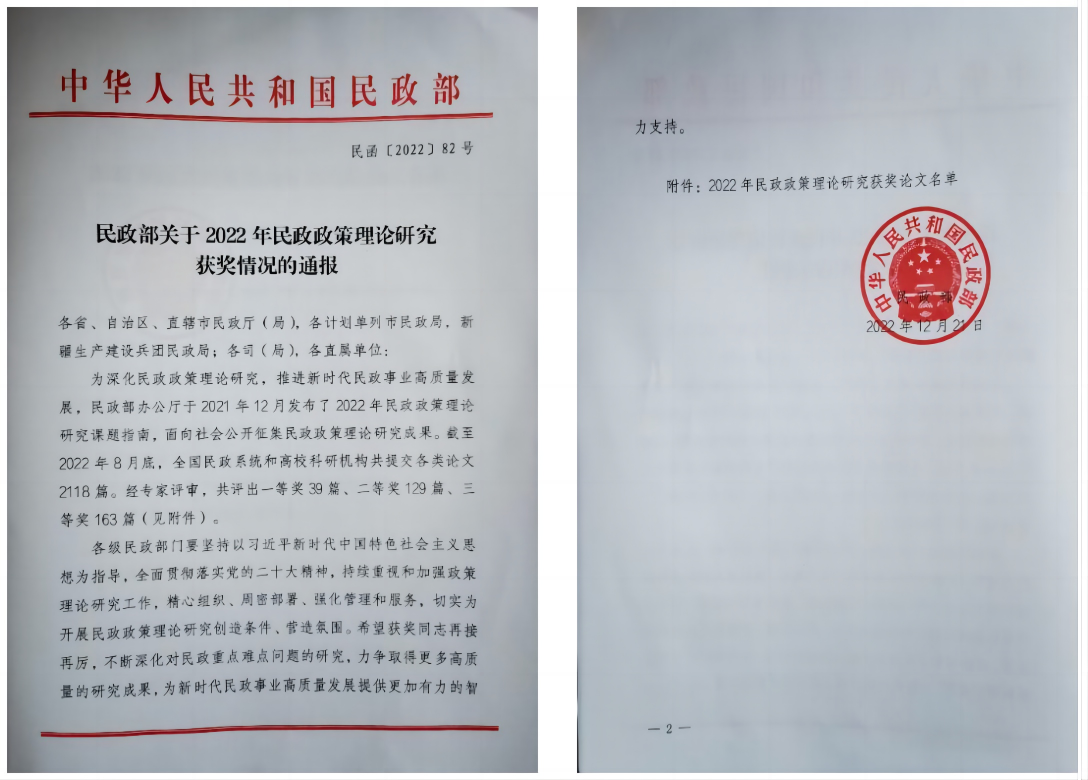 公司邓勇教授团队研究成果荣获民政部全国民政政策理论研究二等奖