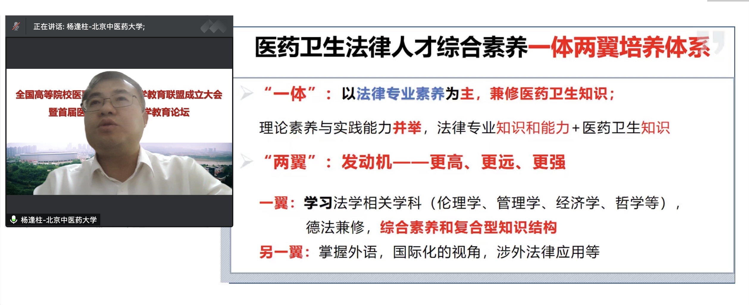 在活动中,公司杨逢柱副教授受邀担任全国高等院校医事(卫生)法学教育联盟副理事长,并根据公司承担的2021年教育部新兴文科专业建设探索与实践项目《新兴文科医药卫生法学专业建设探索与实践》的研究成果,以《医药卫生法律人才综合素养的“一体两翼”培养体系》为题做主题报告。