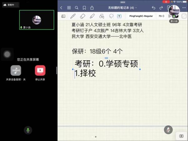 接下来,由“考研钉子户”夏小涵学姐,结合自己的4次考研经验,为同学们扫除考研盲区和误区,总结在考研、保研中面临的各种常见问题。同时,学姐针对法学专业考研和法考如何平衡这一问题为同学们进行讲解和指导,提醒同学们“早准备早有数,不急躁不盲目”。