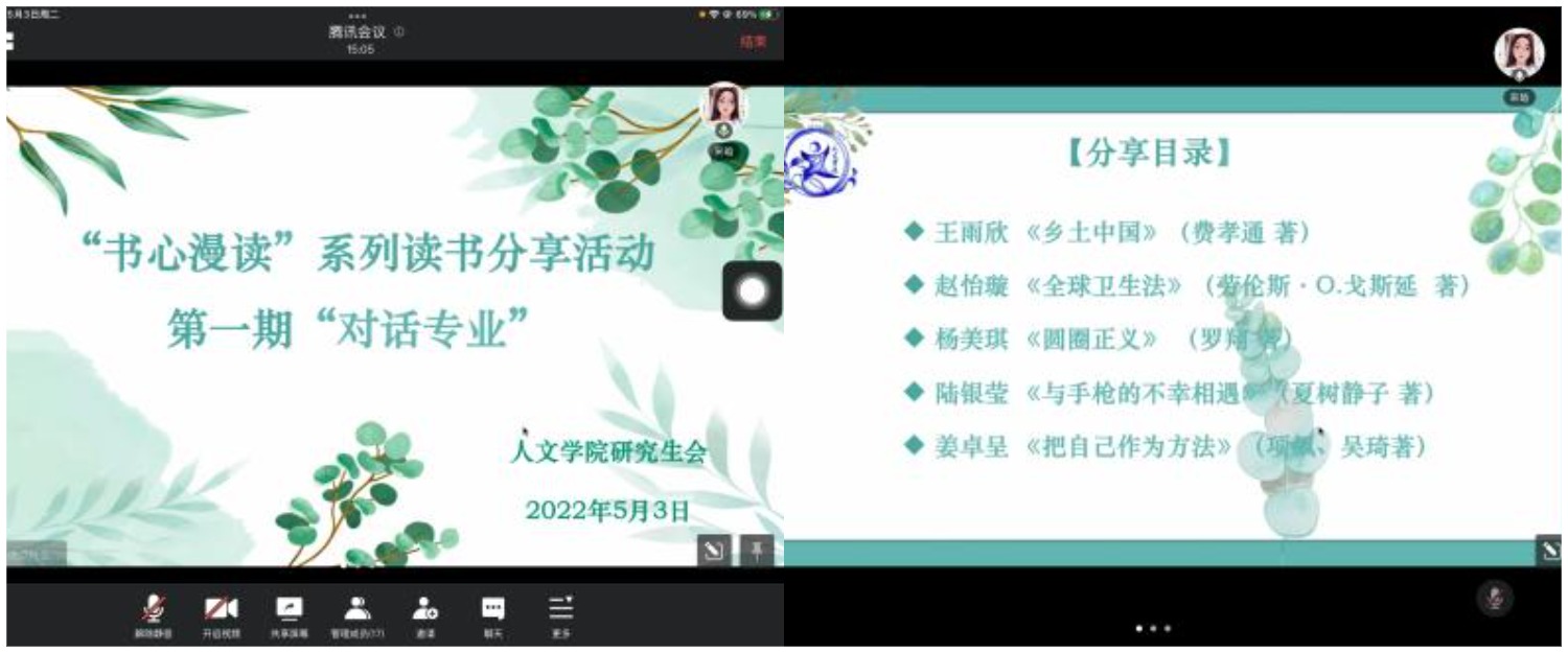 草长莺飞五一至,春光如许好时节。为了鼓励同学们享受假期、热爱阅读,yl7703永利研究生会于5月3日19:00在线上举办了“书心漫读”系列读书分享活动第一期“对话专业”。参与本次读书活动的有yl7703永利辅导员宋晗、五位读书分享人、yl7703永利部分研究生与本科生。