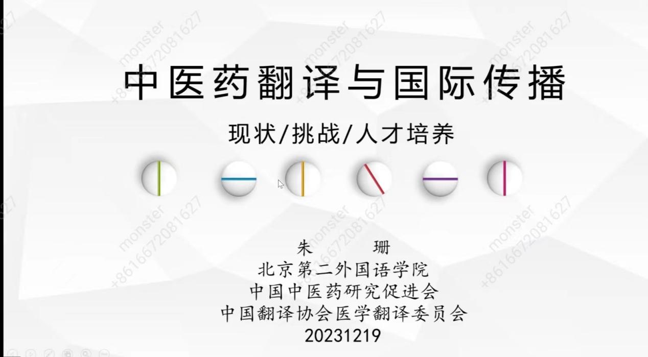 随后,朱教授从中医英译标准、典籍翻译以及线上资源三个方面对中医药翻译与国际传播的现状进行了详细介绍,从四字格中医药术语的逻辑关系辨析、中医药术语标准制定的分歧以及中医术语口译的难点三个方面,揭示了中医药翻译与国际传播所面临的挑战。朱教授指出,从事中医口译实践要充分考虑中医临床口译交际语境的特殊性,以目的语读者的接受程度为导向,以“求大同存小异”的思想指导中医翻译实践。