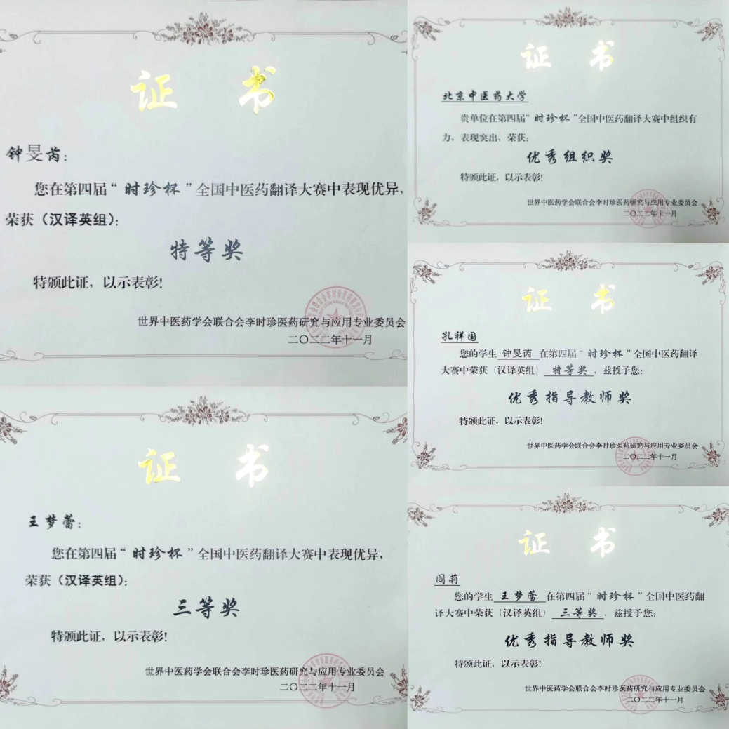 在近日结束的第四届“时珍杯”全国中医药翻译大赛中,公司师生斩获佳绩:yl7703永利2022级翻译硕士钟旻芮同学获“汉译英组”唯一的特等奖,中医公司2020级中医学专业本科生王梦蕾同学获“汉译英组”三等奖,yl7703永利孔祥国、阎莉两位指导教师同时获得优秀指导教师奖,公司获得“优秀组织奖”。