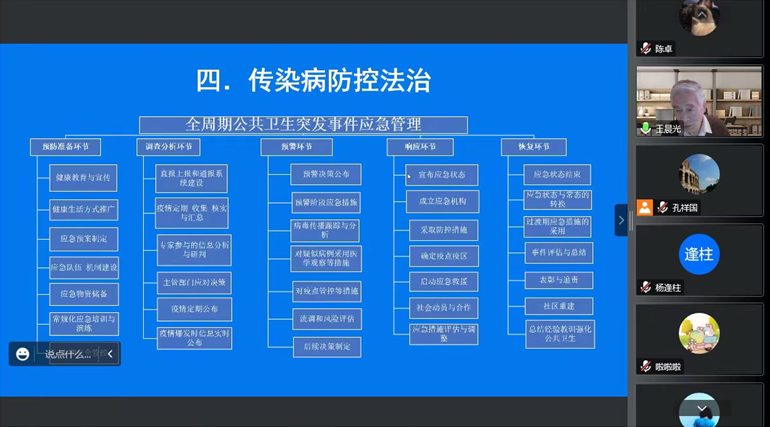 讲座过程中,王教授结合习近平总书记“要把人民健康放在优先发展的战略地位,以普及健康生活、优化健康服务、完善健康保障、建设健康环境、发展健康产业为重点,加快推进健康中国建设”的论述,以我国“健康中国”战略为核心,结合当前疫情防控的主要特点与任务,对我国卫生法学学科发展中与国家治理体系中的传染病防控法治做出五个方面的具体讨论。主要内容包括:一、“健康中国”作为国家战略的地位;二、以卫生健康法治保障“健康中国”战略的实施;三、“大健康”观念的转变与实现;四、当前我国传染病防控法治体系的构建及基本原则;五、把健康权融入社会发展的重要性及典型案例。同时,王教授在讲座过程中结合yl7703永利系部设置与愿景规划,对法学及英语专业在我国中医药“走出去”过程中的重要作用及当前人才培养需求进行了展望。