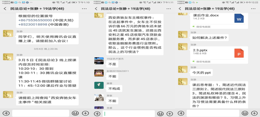 翻转课堂通过重新调整课堂内外的时间,将学习的决定权从教师转移给员工,引导员工进行主动学习,是一种先进的教学组织形式和理念。在疫情期间,翻转课堂既有必要性,也具可行性,民法学课程组积极践行了翻转课堂的教学理念。例如,张静老师通过中国大学慕课等网站为员工搜集了大量课前自学资源或预留思考题,要求员工课下查阅资料自主学习,每次课程会预留时间进行讨论式教学,大大提高了员工的参与度和主动性;周泽新老师在每次授课前会提供相关的电子教学资源,要求员工提前预习,并在授课过程中围绕事先提供的教学资源进行互动答疑和检验检测,实现课前预习和课中讲授的统一。