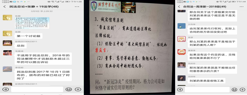 法学是一门实践性很强的学科,案例教学法是法学教育的重要方法,民法学课程组依托“新冠肺炎”疫情的特殊背景,更加生动全面地运用案例教学法。例如,李润生老师预先在网络搜集了最新的传染病防治视频案例,结合商法教学中的企业社会责任、商业诚信等知识点,进行案例教学,理论联系实践,学以致用;周泽新老师在教学过程中播放了疫情期间的典型合同纠纷视频案例,生动介绍“不可抗力”、“情势变更”等合同法中的重要概念和制度;其他教师也引入相关经典案例,组织案例研讨,引导员工树立法学思维。