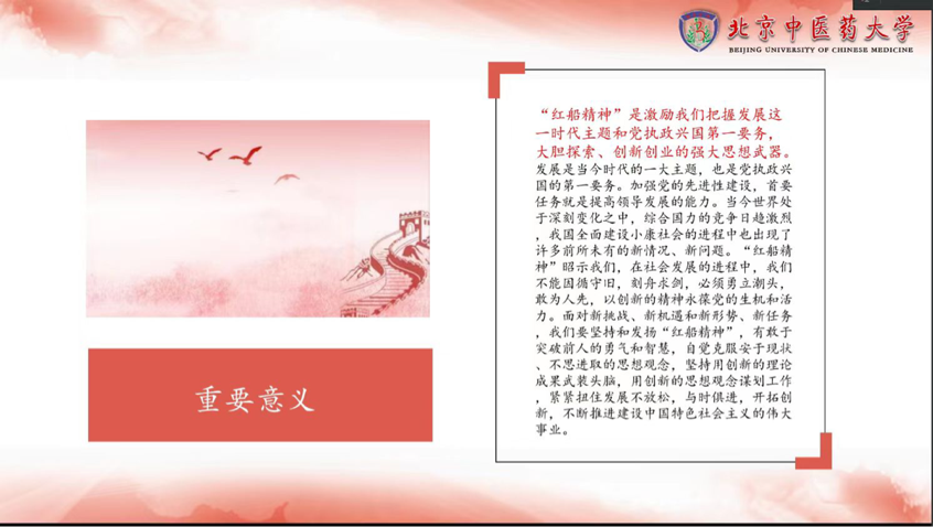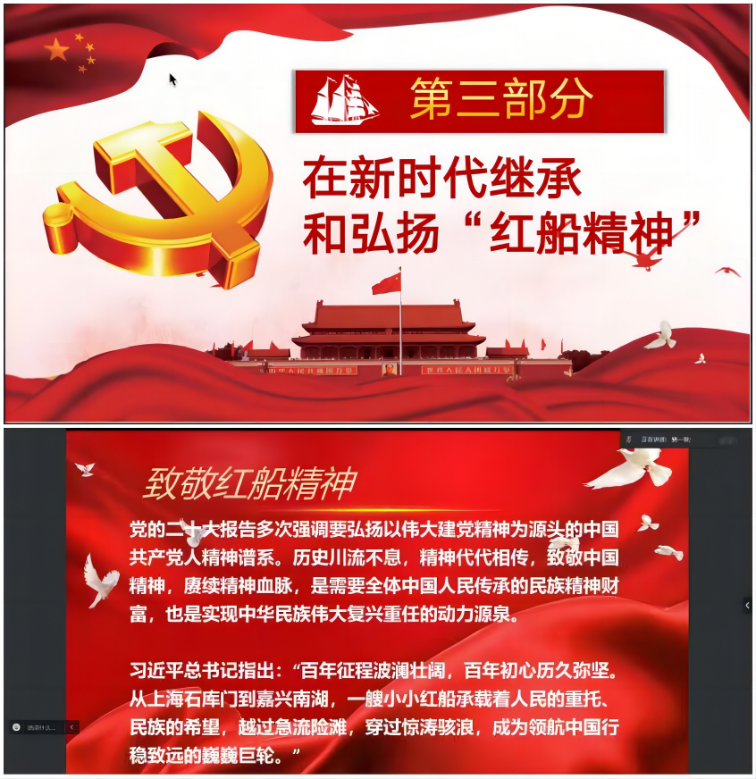 本次共建学习活动的主要内容是学习党的“红船精神”。中国人民公安大学的裴一菲、唐银珊两位同学从“红船精神”的起源、发展娓娓展开,阐述了“红船精神”的内涵。