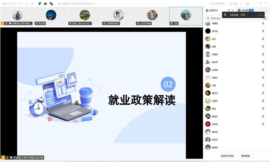 招生与就业科科长于欢做就业政策解读专题报告。在报告中,于老师围绕当前就业形势、各类就业渠道、就业工作准备以及关键就业政策等进行了详细解读。她建议毕业生同学们,要在关注传统就业方向的基础上,结合当前国家发展需求,多关注军队文职、基层项目及新兴领域岗位的招聘信息,以更加广阔的视野为人生的下一阶段打开新局面。