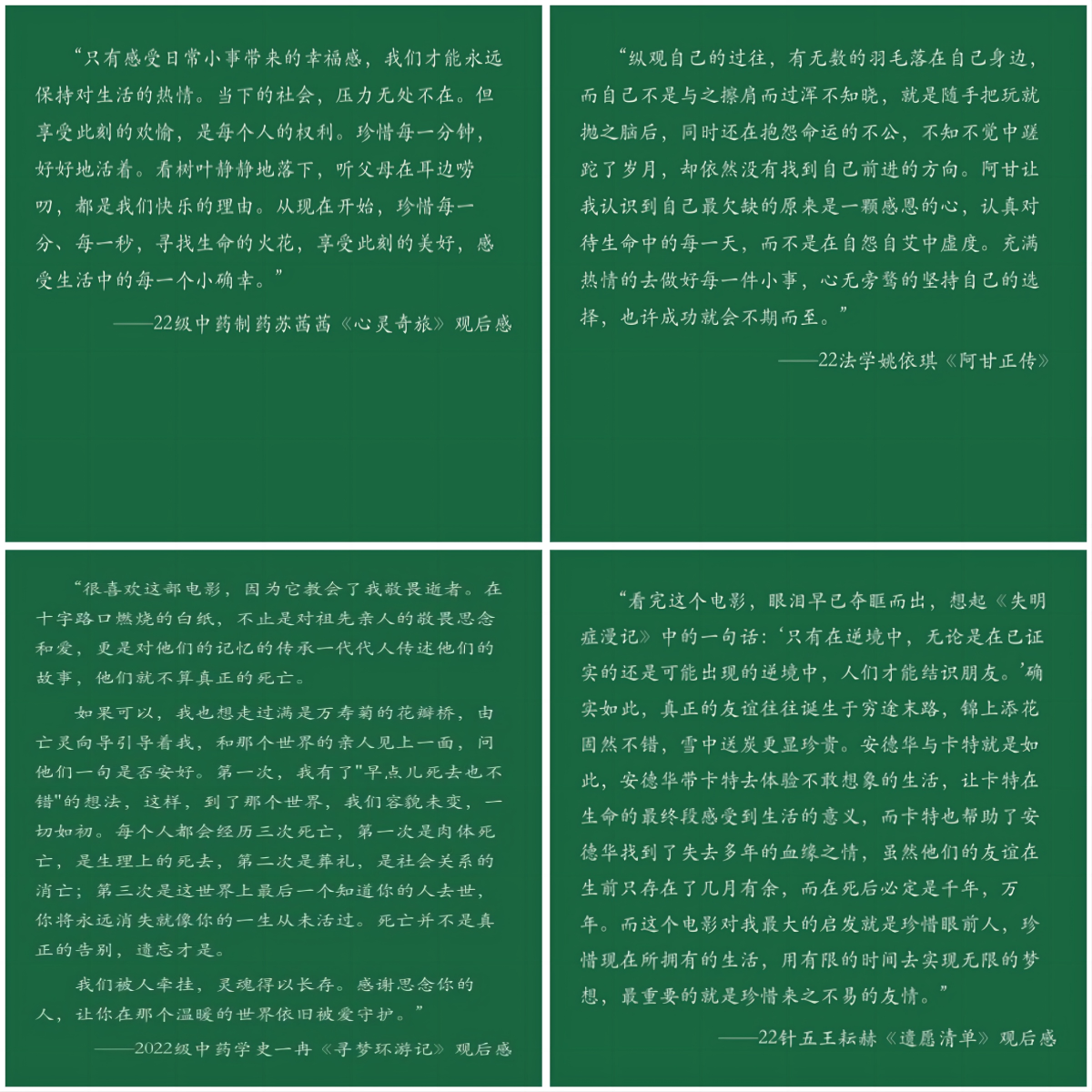 在本次活动中,同学们自行选择观看所给影单中的一部影片并写出自己观看影片后的所思所想。每位同学的观后感都饱含对人生、对生命、对情感的不同体悟。有的同学从观影中体悟到了亲情的重要;有的同学从影片中理解了生命的意义;有的同学通过观影产生了对人生意义的思考。活动结束后,同学们将自己的观影照片与观后感上传至线上邮箱,同学们在本次活动中收获了新的体会与思考。