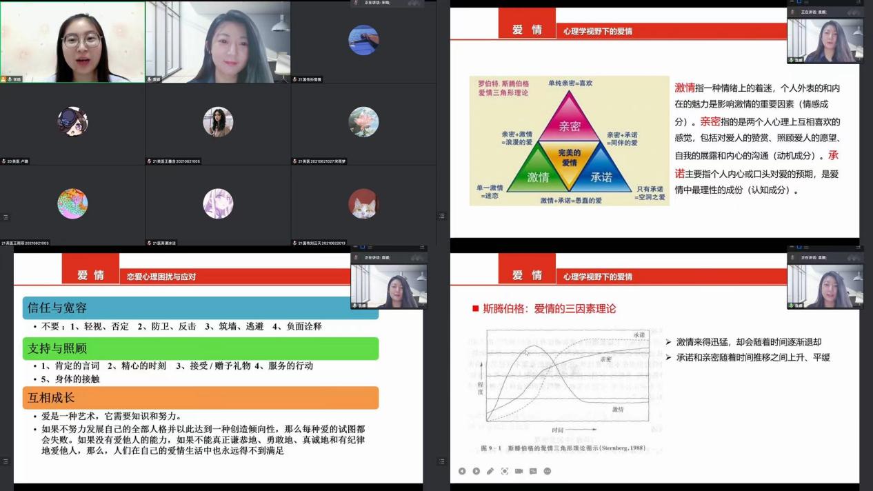袁娜老师首先以“什么是爱情”、“爱情的定义”为引入,通过网络短视频与生活实例为同学们简单阐述了心理学上的爱情概念,区分了爱情与喜欢的差别。接着,老师解释了心理学上的爱情三角形理论,包括激情、亲密、承诺三个要素和三要素之间的联系。最后,老师分享了性心理学的相关知识,让同学们对两性观念与爱情观念有了更加深入的认识。讲座过程中,同学们仔细观看短视频与示例,聆听老师从心理学角度分析得出的恋爱技巧。