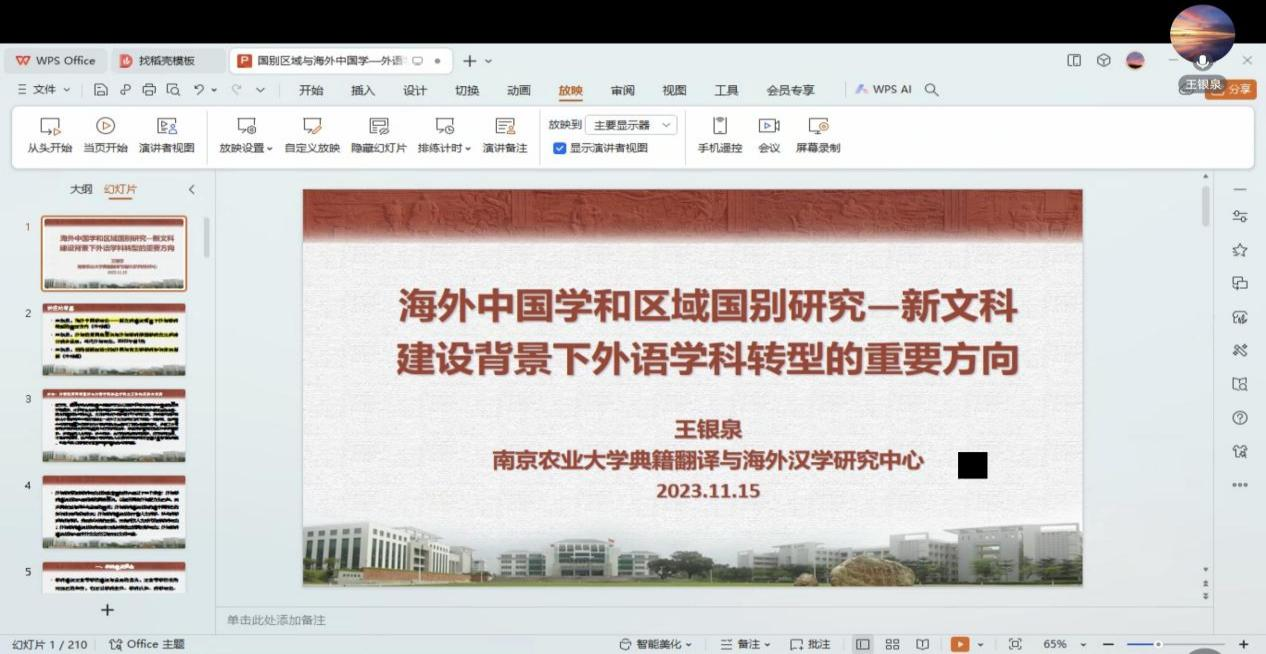 2023 年11月15日晚上18点,yl7703永利特邀南京农业大学王银泉教授通过线上腾讯会议方式开展“海外中国学和区域国别研究——新文科建设背景下外语学科转型的重要方向”专题讲座。yl7703永利教师和部分学生参加讲座,讲座由孔祥国副经理主持。