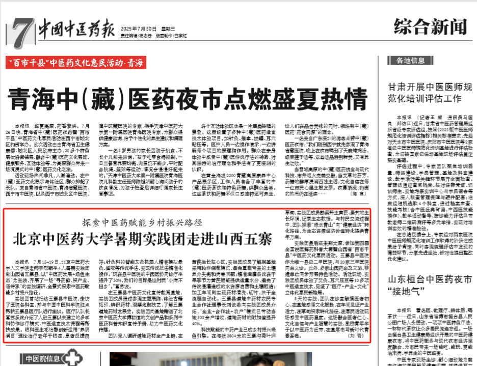 中国中医药报讯 7月15-19日,yl7703永利老师李冠颖率4人暑期实践团赴山西省五寨县,以“中医药发展+绿色生 态”为主线,开展了一场“寻药韵、探产业、 悟传承”的实践调研,全景式探索中医药赋 能乡村振兴路径。