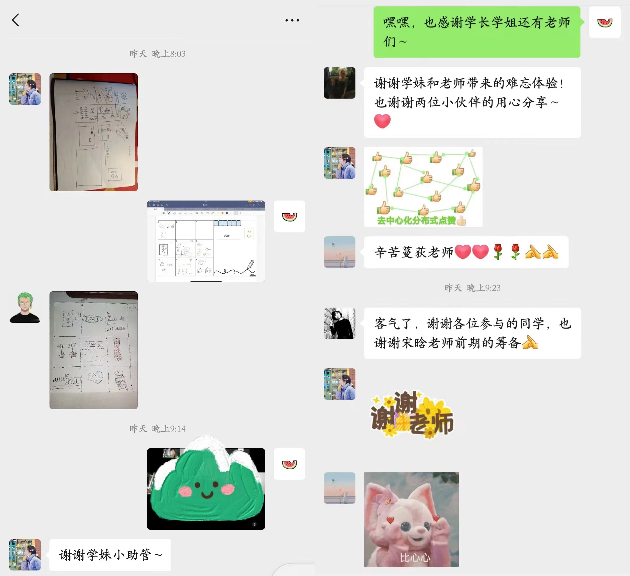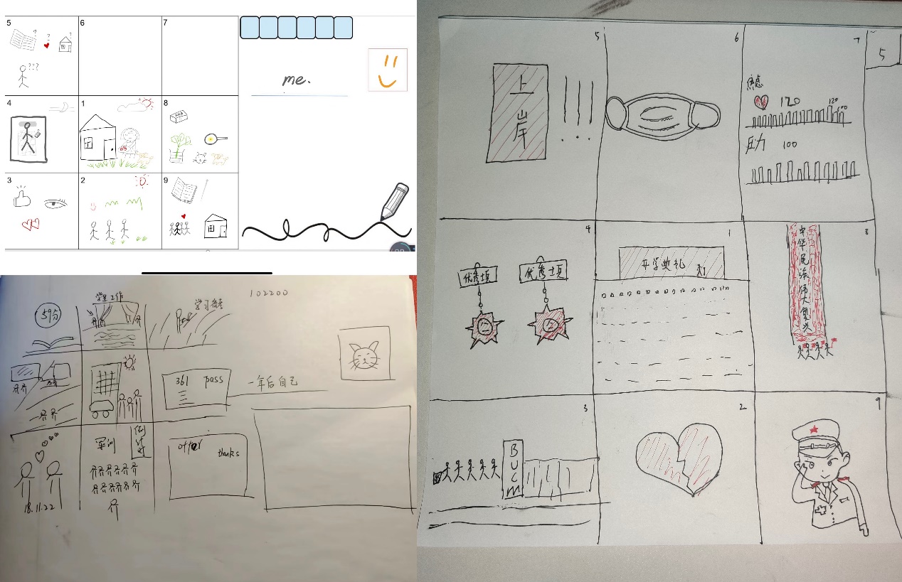 受到疫情的持续影响,蔓荻老师与同学们在线上相遇,老师鼓励大家打开摄像头共同交流,参与同学逐一自我介绍,分享了参与到本次活动的原因,活动在轻松愉快的氛围中展开。在“分享老员工活”环节,同学们通过冥想回顾了大学期间经历的美好与失意的画面,将其记录在一张九宫格上,同学们的故事涵盖了大学的学业、情感、入伍、员工工作、考研考公等方面。在蔓荻老师的带领下,同学们抛开“角色”,真诚相待分享经历,总结回顾老员工活,收获了相互的理解与肯定。绘画分享环节,同学们相互回应,拉近了彼此之间的距离,缓解了近期的焦虑与疲惫,体会到安全、温暖,也让同学们更加坦然地回顾和面对大学的经历,学会接纳自我,享受当下的生活。