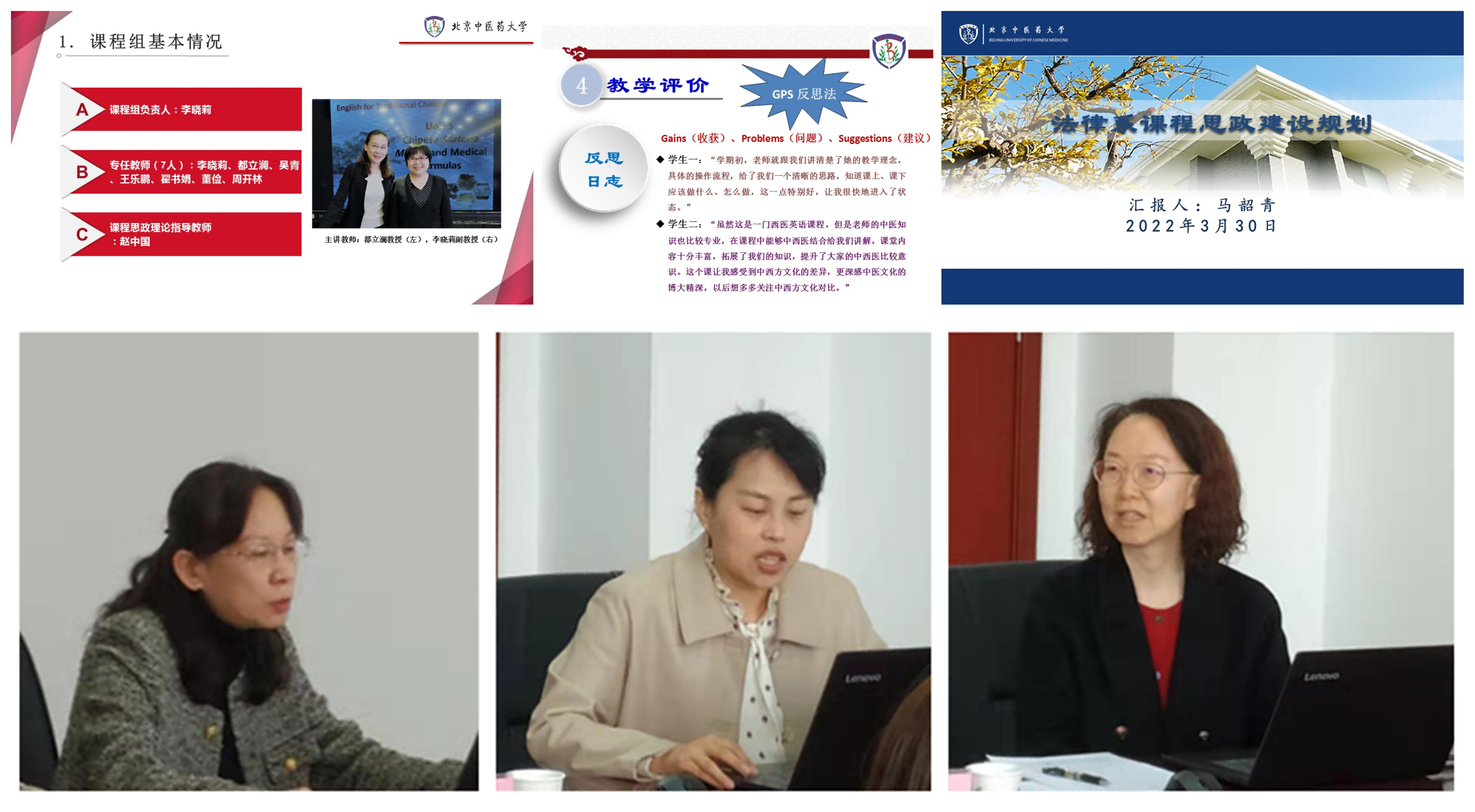 都立澜教授代表第一批校级课程思政示范课程《中医英语》课程组进行了汇报。课程组围绕“家国情怀”、“国际视野”、“跨文化意识”、“中医人文素养”等目标,通过显性教育与隐性教育相结合的方式,实现全程育人与全方位育人。她着重介绍了产出导向法(POA)及基于POA的课程思政教学模式,就今后如何进一步优化课程思政教学设计、加强联动课程建设及编写相关教材做出了展望。