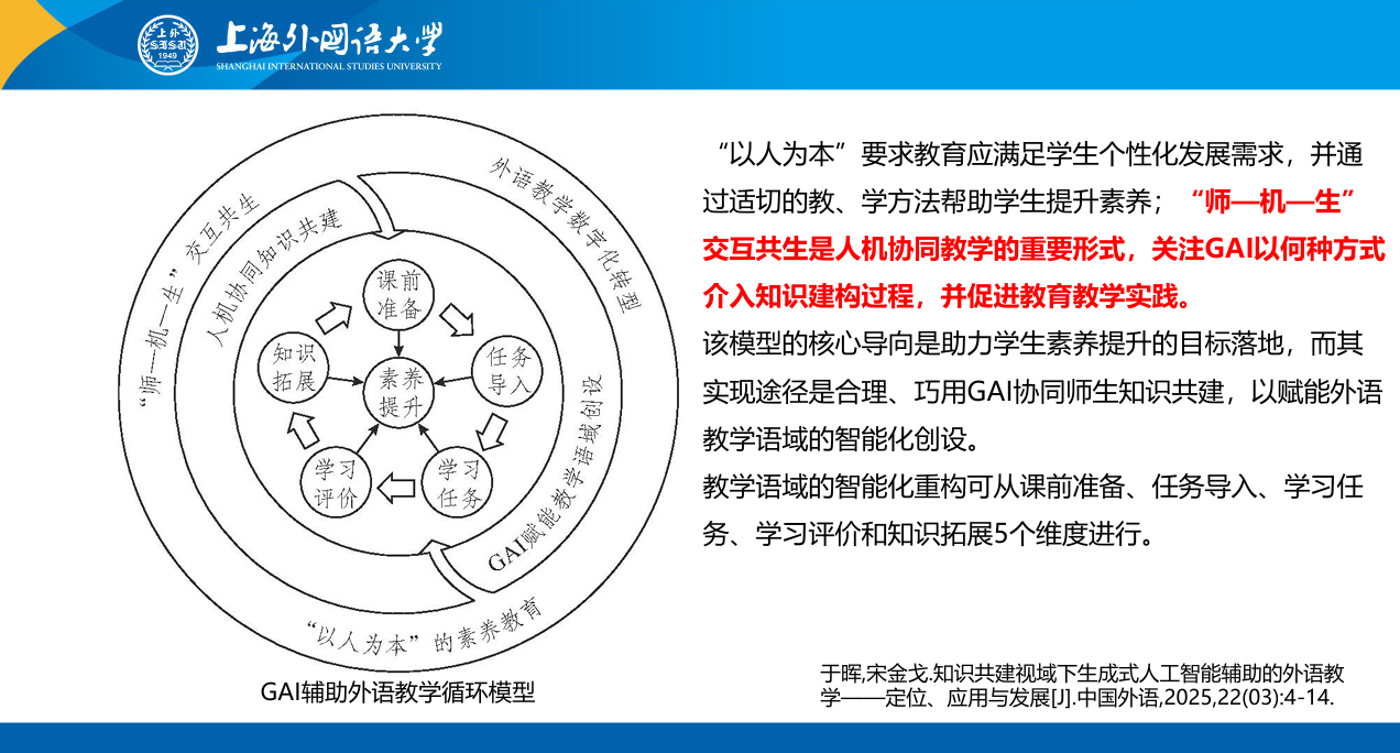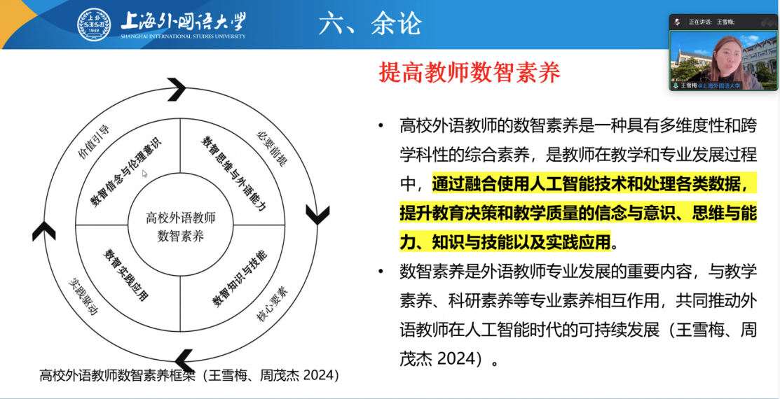 在案例分享环节,王教授展示了生成式人工智能在外语教学、学术写作、学情分析等方面的应用实例,并介绍了“智能体”辅助教学、个性化学习系统等创新实践。她鼓励教师积极开展跨学科研究,不断提升科研素养与教学能力,培育兼具国际视野与数字素养的复合型外语人才。