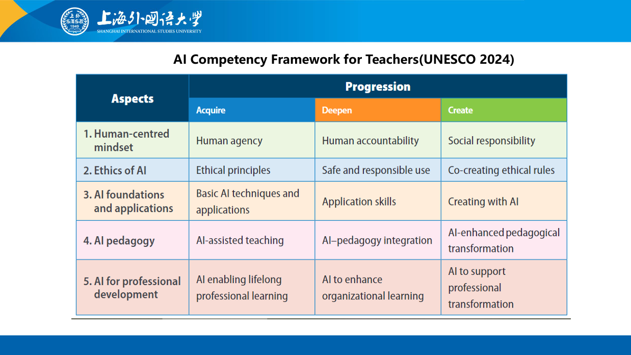 讲座伊始,王教授从教育数字化国家战略切入,系统阐述了外语教师专业发展的时代内涵与能力框架。她强调教师在数字时代的角色重塑与素养提升,详细解读了《教育部办公厅关于组织实施数字化赋能教师发展行动的通知》等政策文件。她介绍了人工智能技术应用于外语教学的相关模型,指出教师应主动拥抱人工智能技术,将其融入教学设计与科研创新,同时注重教育伦理与员工心理健康,实现技术赋能与人文关怀的有机结合。