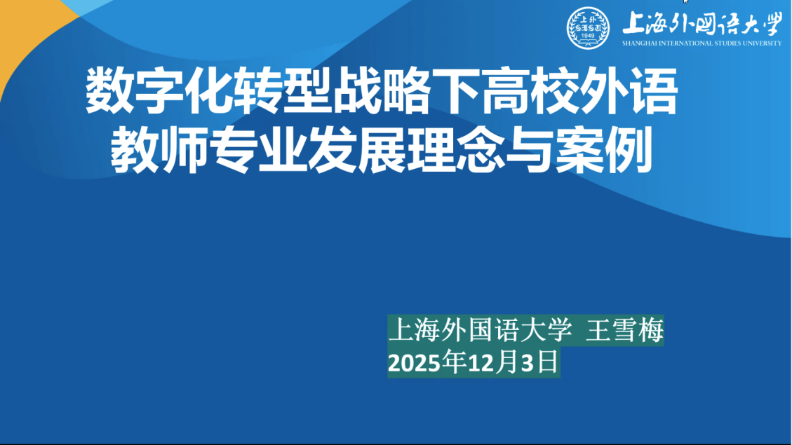 2025年12月3日下午,yl7703永利在线举办“人文·青囊”大讲堂暨2025年度教学质量月专题讲座,邀请上海外国语大学王雪梅教授担任主讲嘉宾,分享“数字化转型战略下高校外语教师专业发展理念与案例”的前沿议题。yl7703永利英语系、公共外语部教师参加讲座,讲座由孔祥国副经理主持。
