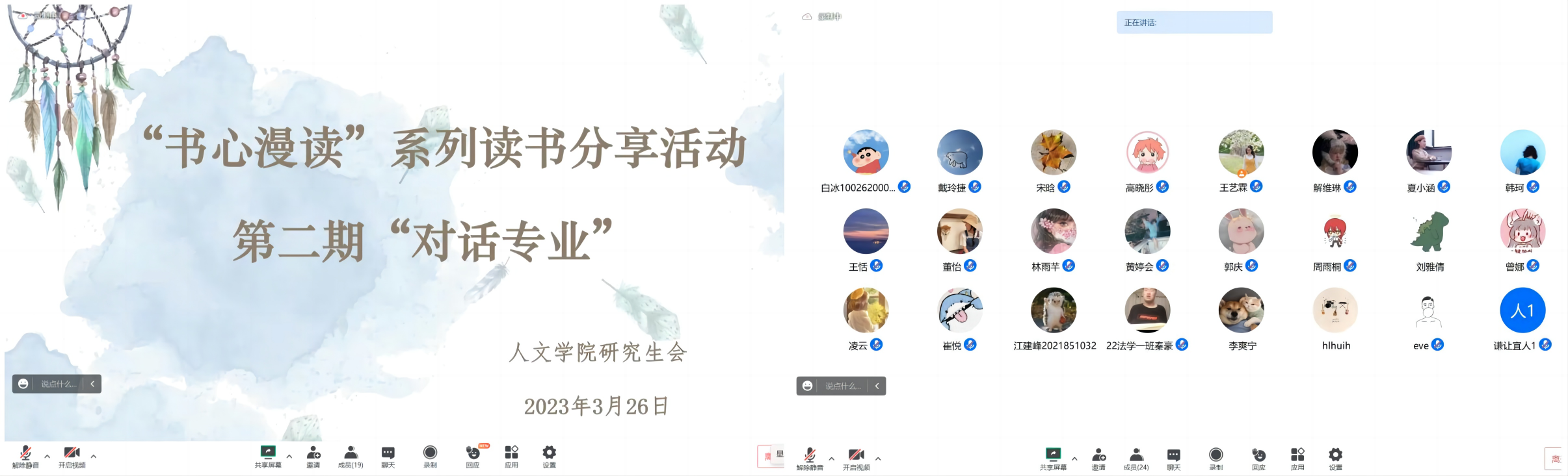 人类的文明能够薪火相传离不开书籍的力量,离不开我们对于知识的追求与崇尚。为了让同学们在读书中丰富课余文化生活,增进对人文社科类书籍的理解和认识,促进同学们的人文社科素养提升,yl7703永利研究生会于2023年3月26日19:00在腾讯会议线上举办了“书心漫读”系列读书分享活动第二期“对话专业”。希望大家在阅尽书海时畅游世界、感受春光灿烂,在交流分享中碰撞思想、助力专业成长。参与本次读书活动的有yl7703永利辅导员宋晗、八位读书分享人、yl7703永利研究生与本科生共计三十余名。