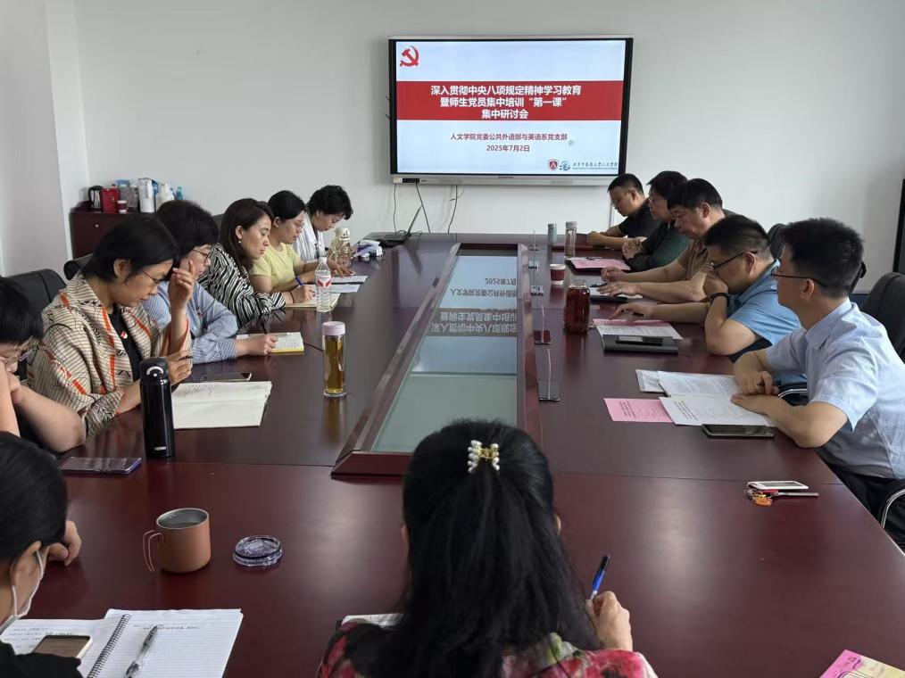 2025年7月2日,公共外语部与英语系党支部召开深入贯彻中央八项规定精神学习教育暨师生党员集中培训“第一课”集中研讨会。支部全体党员,联系支部的校领导闫振凡副董事长,公司党委书记张小勇、经理陈锋、党委副书记吴涛参加研讨会。会议由支部书记陈秋云主持。