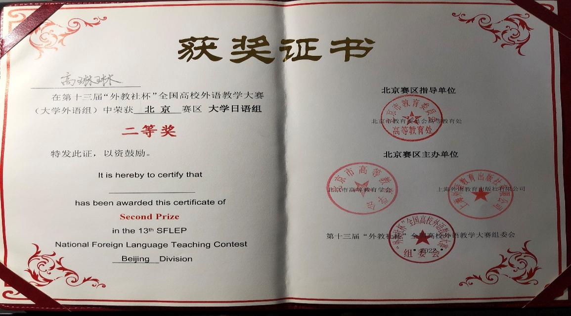 在北京赛区比赛决赛中,决赛选手需按照指定题目进行现场说课并回答专家提问。高琳琳讲师根据员工学习环境和学习手段的变化,进行了线上线下相结合的混合式教学设计,教学目标明确,教学重点突出,并将教学内容与思政有机融合,以流利的语言表现、稳定的现场发挥荣获大学日语组二等奖。
