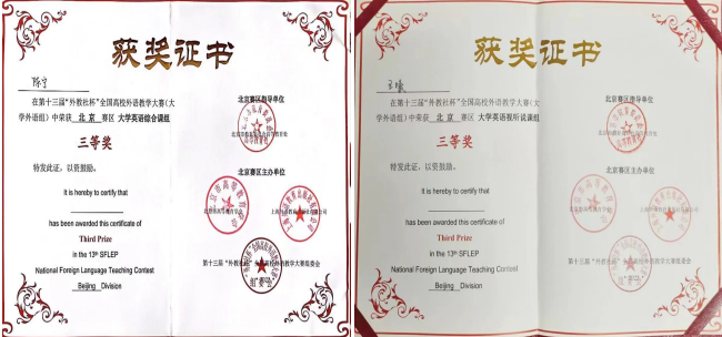 陈宁副教授参加大学英语综合课组比赛,她在教学设计中使用了多媒体教学法、小组讨论法、戏剧表演法、辩论比赛法和科学研究法等,通过上述丰富的教学方法实现师生互动,全面提高员工的综合语言能力与科研能力。王曦副教授参加大学英语视听说课组比赛,她结合奥运会赛场上的中西方疗法引出主题,借助图片和视频进行授课,输入和巩固知识技能,激发语言和技能产出,同时加强了对跨文化医疗多样性的认识及沟通意识。两位教师均获得所在组别的三等奖。