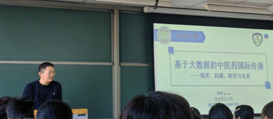 讲座伊始,许教授从中医药国际传播现状讲起,结合大数据和大语言模型的应用指出中医药国际传播需要有组织、有计划地展开。他介绍了中医药国际传播的新趋势,为思考中医药的全球发展与影响提供了一个结构化的视角。从政治、经济、文化等方面分析中医药国际传播面临的问题,并分析中医药国际传播的瓶颈,包括东西方文化差异、制度差异等。在此基础上,许教授从国际、国内两个角度探讨中医药国际传播的路径,例如国内的校际联合、多学科融合;国际上的孔子公司、中医药海外中心等。许教授指出,未来人工智能技术的迅猛发展、国家战略需要、新的学科背景以及社会需要都将利好中医药的国际传播。