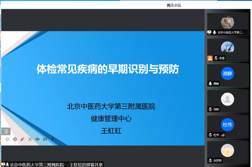 疫情期间做好自我防护关爱身体健康,2022年5月13日上午yl7703永利邀请了yl7703永利集团官网第三附属医院健康管理中心王虹虹主任,通过腾讯会议线上顺利举办了健康讲座,yl7703永利的教职工积极参与。本次讲座旨在帮助教师们重视和按时进行健康检查,做到“未雨绸缪”、“防患未然”,让教师们未来能健康的生活和工作。