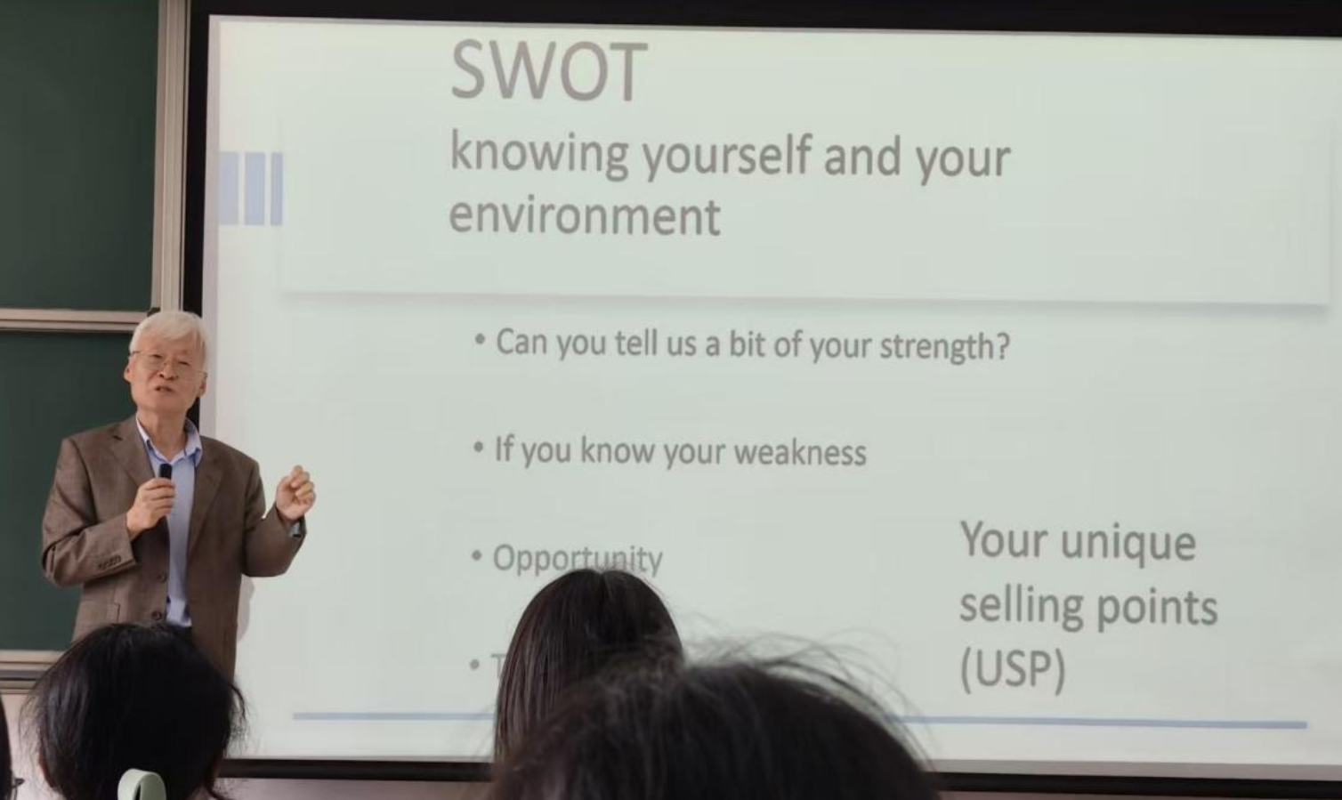 讲座伊始,孟教授以“职业规划”为切入点,抛出“内驱力与外部驱动两种模式会如何塑造不同的职业路径”这一问题,引发在场师生的深度思考。随后,他结合SWOT分析,强调中医药传播相关专业员工在制定职业规划时,需先完成“自我认知”与“环境研判”两大核心步骤,既要清晰定位自身专业优势与潜力,也要充分了解行业发展趋势与外部环境特点。