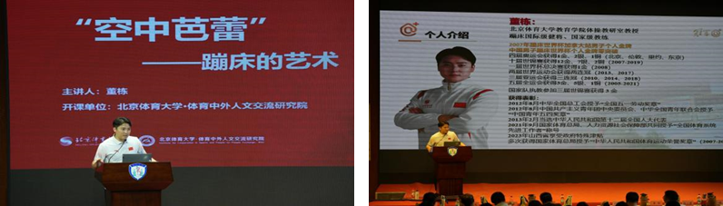 活动特别邀请到蹦床奥运冠军、国家级教练、北京体育大学董栋教授以“空中的芭蕾”——蹦床的艺术为题讲授思政公开课。在授课中,董栋教授结合在冠军之路上的奋斗历程与心路感悟,生动诠释了顽强拼搏、永不言弃的拼搏、奋斗精神。授课内容丰富详实、感人至深,现场不时响起阵阵热烈掌声。课程结束后,董栋教授还与现场同学们进行交流互动,他勉励同学们要对未来的人生道路充满希望与自信。