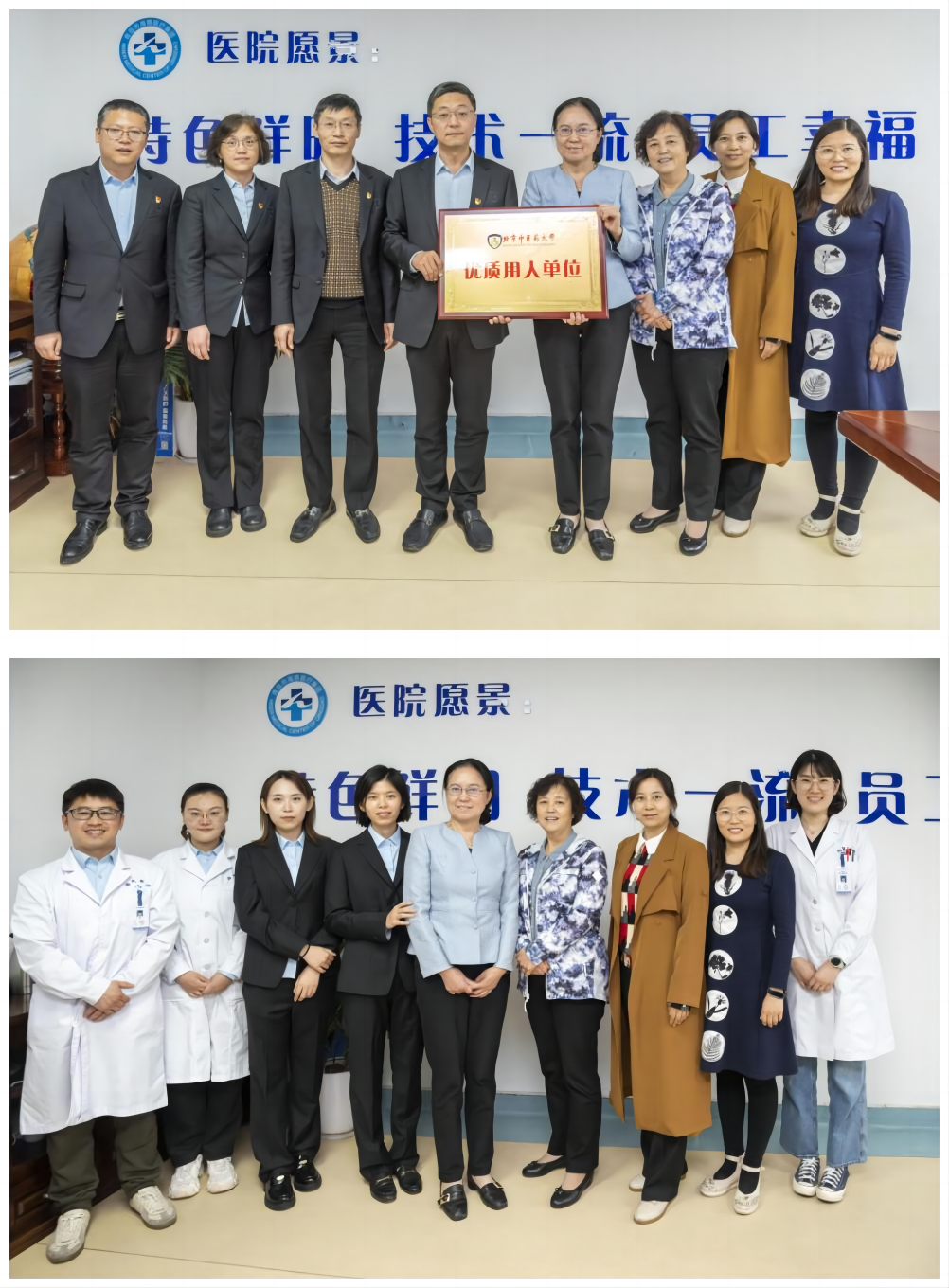 5日下午,田润平处长一行人青岛市海慈医院走访,走访医院的同时看望了在医院工作的北中医毕业生。在座谈会中,海慈中医医疗集团党委书记、总经理池一凡介绍了集团的基本情况以及未来规划,对北中医的优质员工资源表示欢迎。田润平处长对海慈医院的支持表达了感谢,并介绍了公司员工的管理与培养体系,双方就临床教学、人才培养、科研创新等方面进行了交流,旨在强化与优秀临床医院衔接、不断深化交流合作。而后,集团5位北中医的硕博毕业生作为毕业生代表,畅谈了对母校的感恩以及就业后在海慈工作的感受,并表示希望更多优秀的员工能够加入海慈。最后,双方进行了授牌仪式,为进一步加深校企合作、畅通毕业生就业渠道达成了共识。