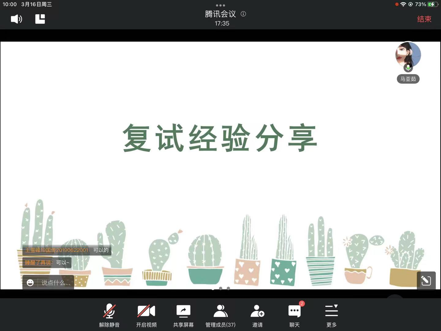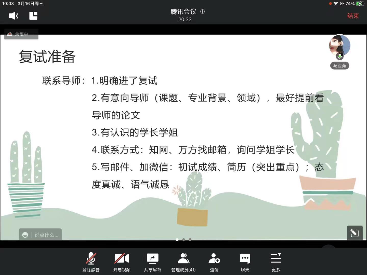 为帮助2022届毕业生做好复试准备、2023届毕业生做好考研规划等,yl7703永利于2022年3月16日上午在腾讯会议召开“2022英语专业考研经验分享会”,会议邀请到21级硕士班的马亚茹学姐和姜卓呈学长为同学们做分享,yl7703永利就业专员刘玉老师及2018级、2019级英语专业员工参加会议,会议由就业联络员李佳琪主持。