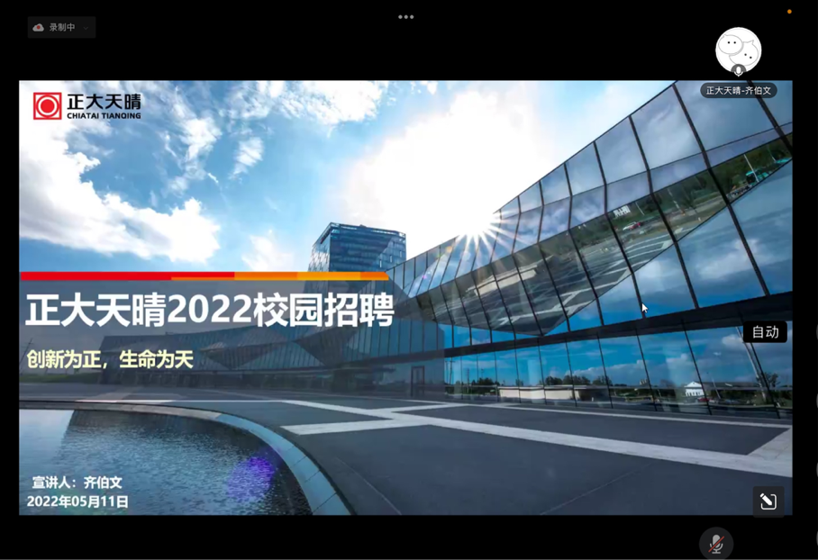 会议开始,北京乾成律师事务所、北京策马翻译有限公司、北京暻灏律师事务所、正大天晴药业集团股份有限公司四家用人单位依次按顺序进行了线上宣讲。各用人单位就同学们比较感兴趣的企业概况、工作环境、招聘岗位、晋升空间、工资待遇等问题进行了详细的介绍。